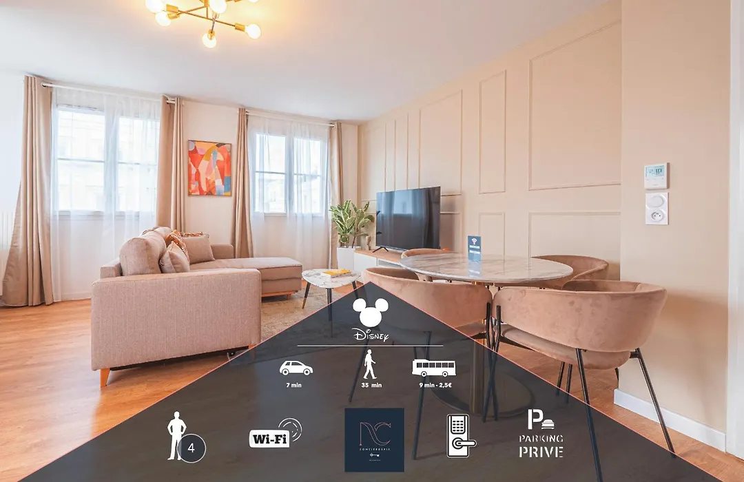 El *Disneyland-Paris* 4 Pers, Wifi, Parking está amueblado con un sofá con instalaciones modernas, como TV y TV de pantalla plana con canales vía satélite. Las habitaciones están equipadas con detectores de humo. Este apartamento consta de 1 baño. También dispone de una bañera.